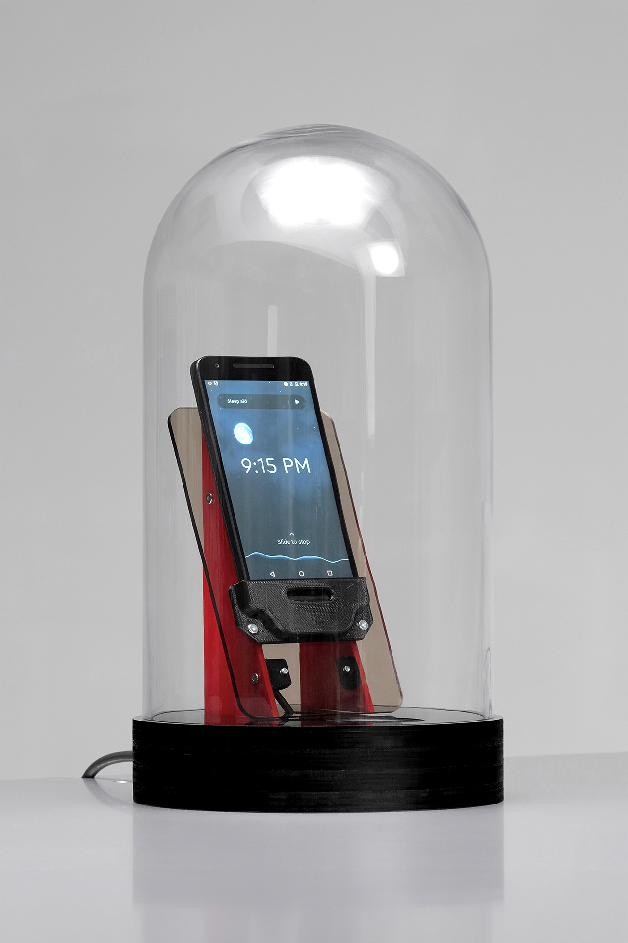 Sleepbot is designed to house a smartphone under its glass cover to isolate it from ambient noise. Placed next to a speaker broadcasting white noise, it is immersed in a sound environment similar to that of a bedroom in which a person would be sleeping. At regular intervals the speaker emits noises that simulate the movements of a sleeping person during a shallow sleep phase. In such a context, the sounds captured by the smartphone are those of a perfect, restful sleep and make the user appear to have very good sleep patterns.