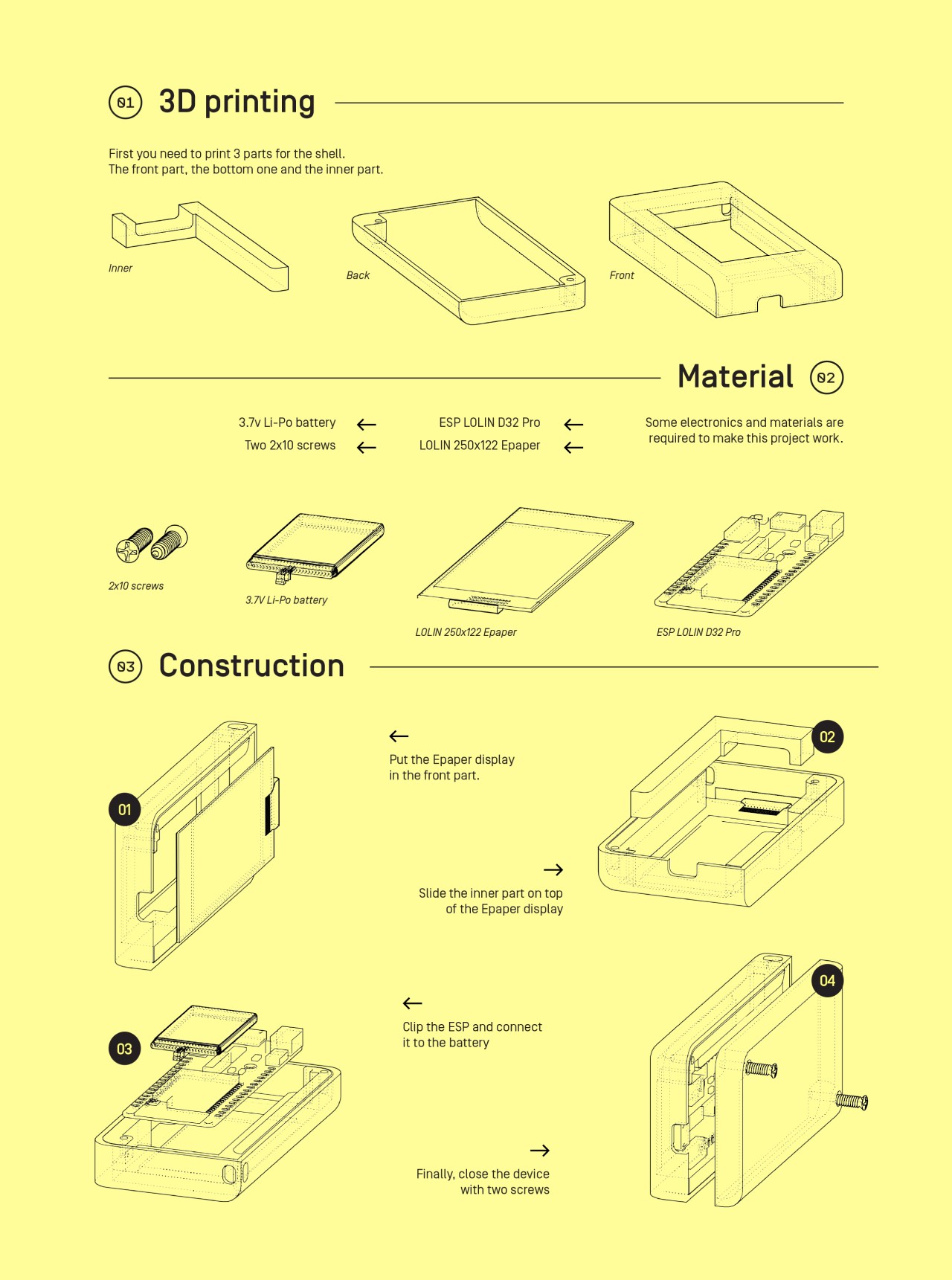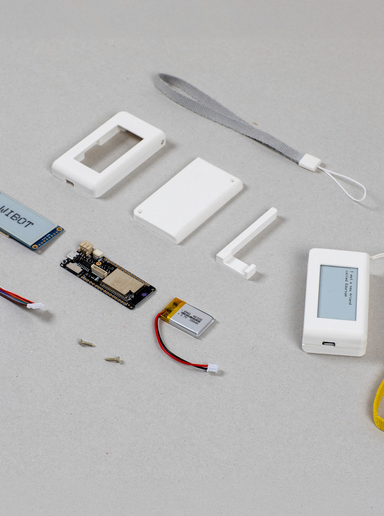 The Wibot is a portable, open-source device with an e-paper screen. It can be built by printing three shell parts and assembling some electronics, with an option to add a strap for easy carrying. Wibot acts as a mediator between users and nearby machines, displaying information about its interactions with the environment in a friendly, human-like tone. For instance, it can reveal the number of Wi-Fi networks it detects, track encounters with specific networks, or express boredom if no new connections appear. Autonomous and energy-efficient, Wibot operates continuously without requiring power toggles, helping us better understand our digital surroundings.