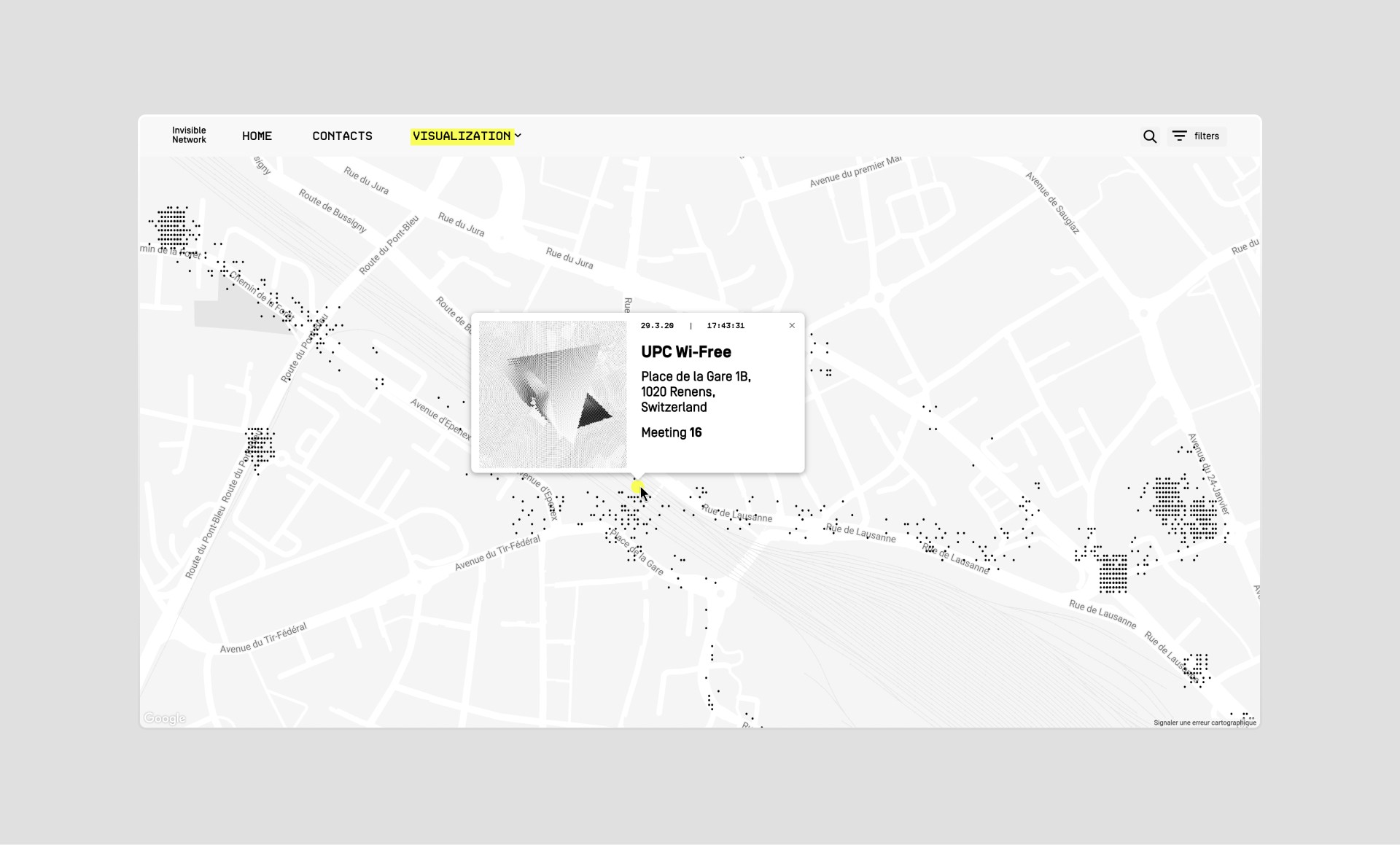 Two data visualization modes are available. On an interactive map, it is possible to consult in real time all the crossed Wi-Fi networks. Each of its Wi-Fi has its own physical address. You can also visualize these Wi-Fi networks on a timeline, which allows you to see the density of communications on a time scale.