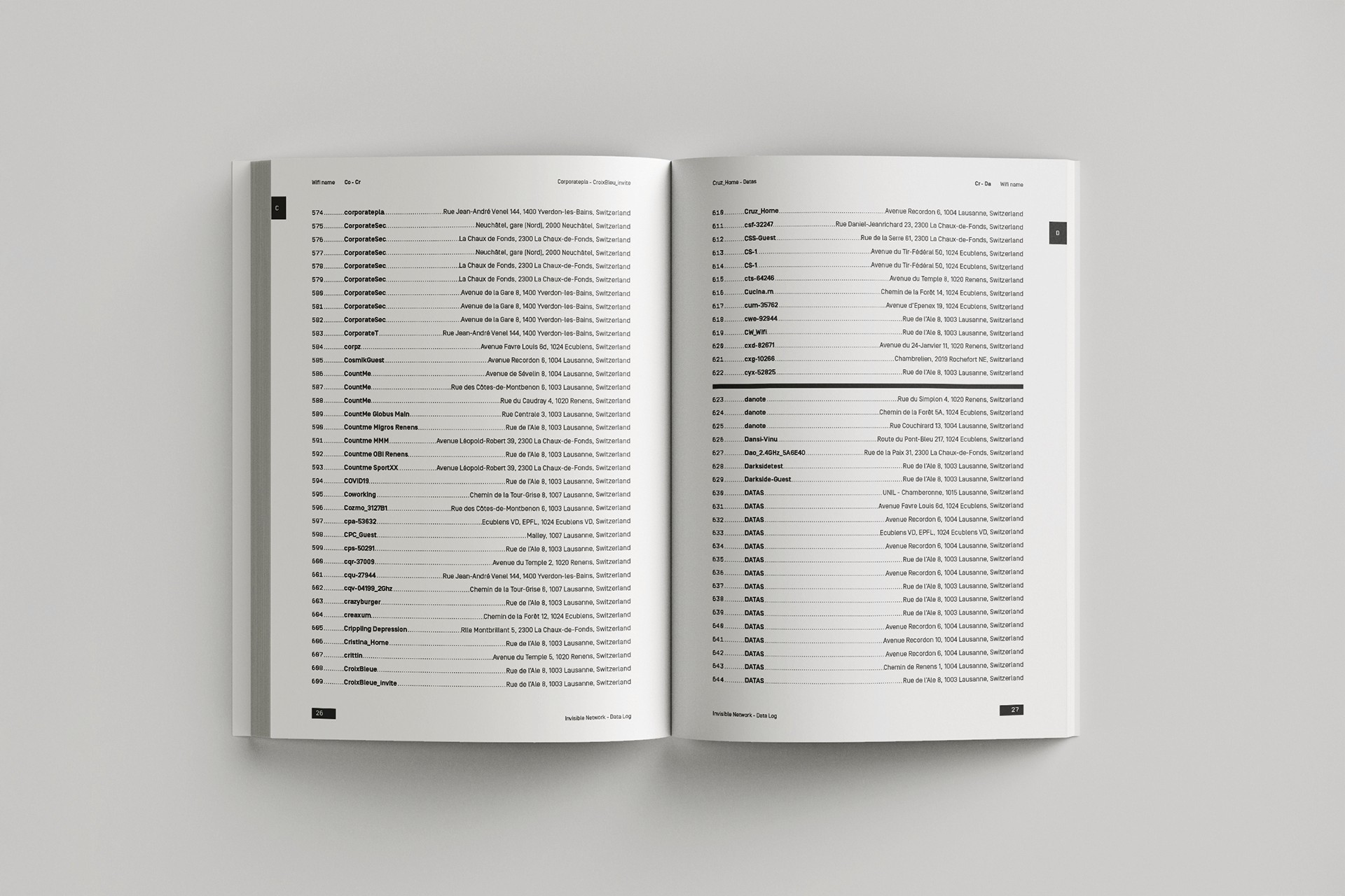 A print edition was created to visually represent the vast amount of Wi-Fi data recorded by Wibot. This edition serves as a comprehensive directory of Wi-Fi networks, meticulously documenting the details of each one. Much like a traditional phone book that lists telephone numbers and addresses, this directory provides an organized catalog of Wi-Fi networks, including their names and associated addresses. It not only highlights the scope of Wi-Fi data captured by Wibot but also transforms this digital information into a tangible, physical format, bridging the gap between the virtual and real worlds. This printed record acts as both a reference and a visual testament to the prevalence and ubiquity of wireless networks in our modern environment.